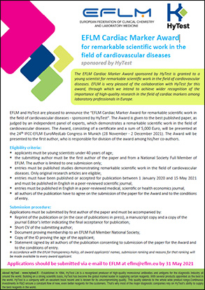 We are delighted to let you know that we are sponsoring the EFLM-HyTest Cardiac Marker Award for remarkable scientific work in the field of cardiovascular diseases.